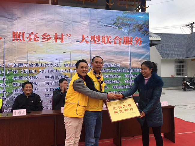 覃建雄先生與廣東獅子會涼山委員會賴先生接受沙苦村領(lǐng)導贈送牌匾