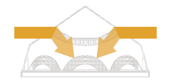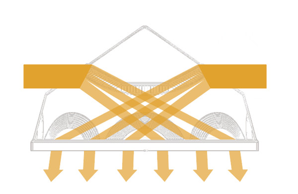 不僅使上午及下午陽光轉(zhuǎn)向?qū)?,還對光線進(jìn)行聚焦,提高采光效率。